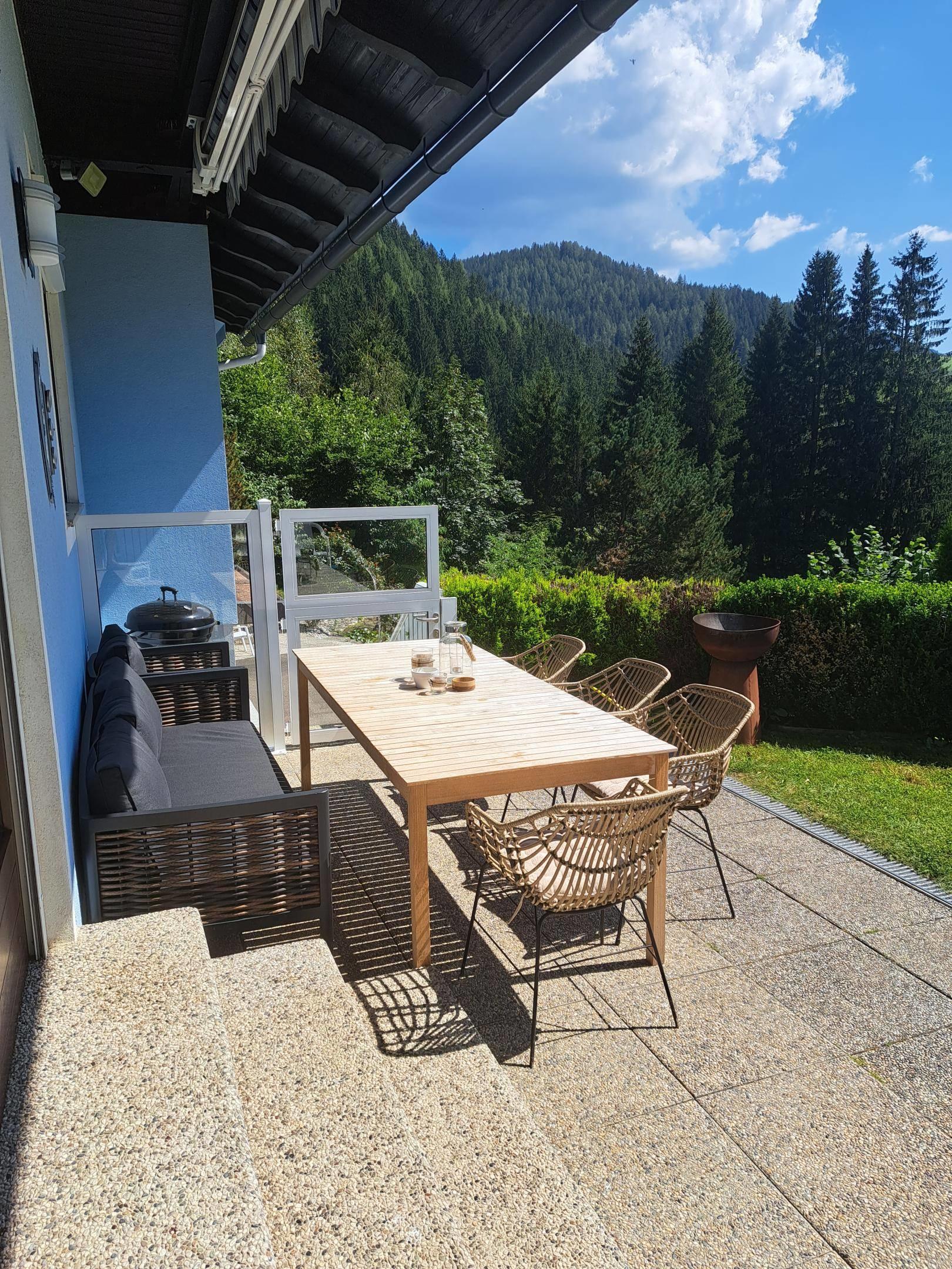 Die Terrasse bietet viel Platz zum Verweilen mit herrlichen Blick zu unserem Bauernhof,