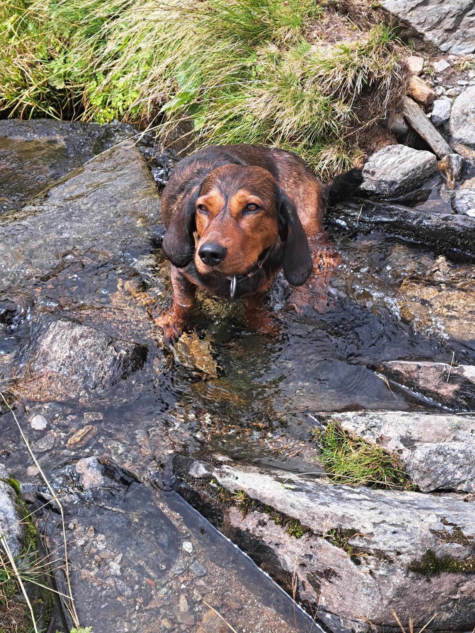 wo Milchkühe, Kälber, Hasen und unsere Dachsbracken Hündin Anka leben, die sich jederzeit